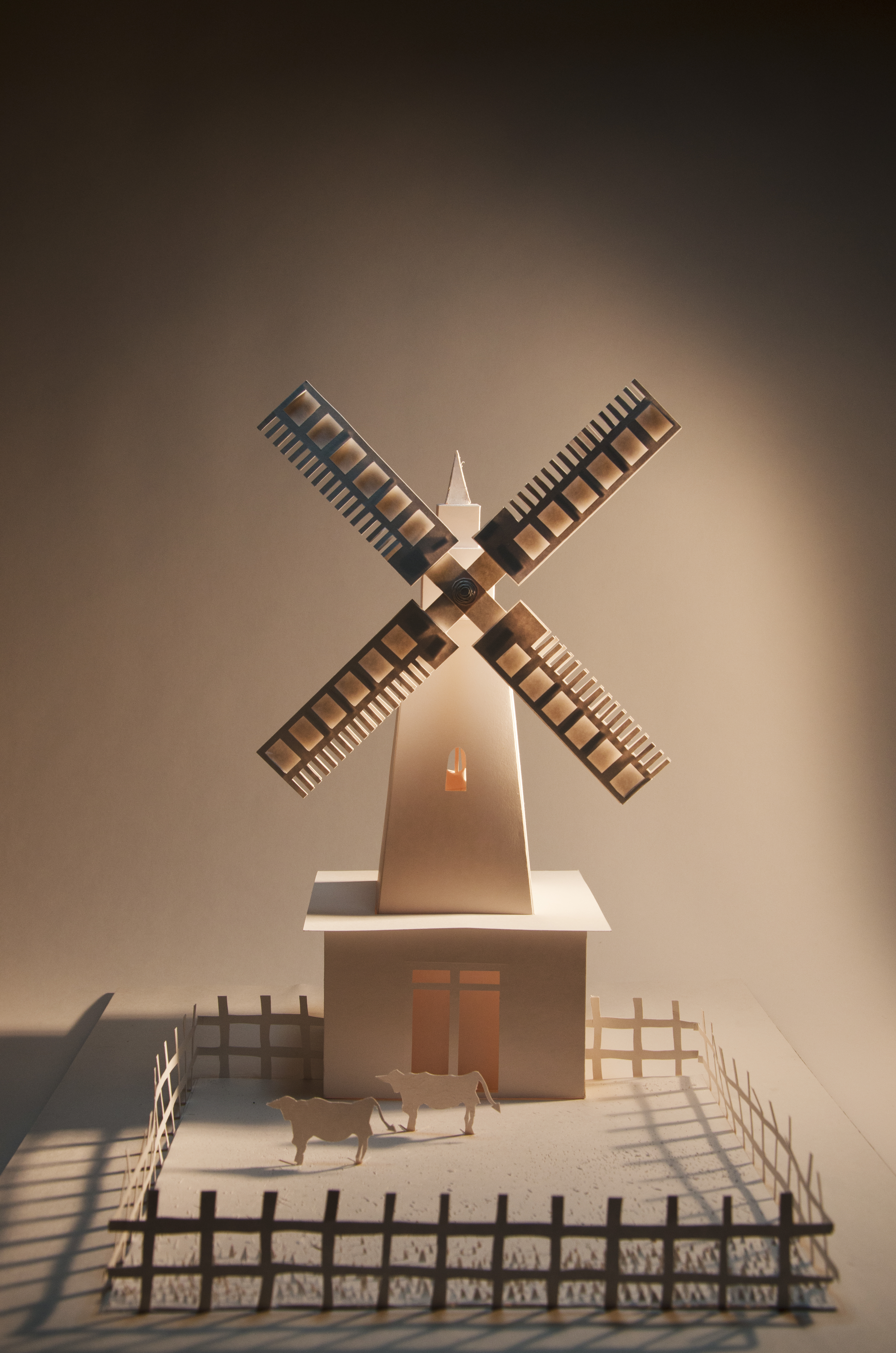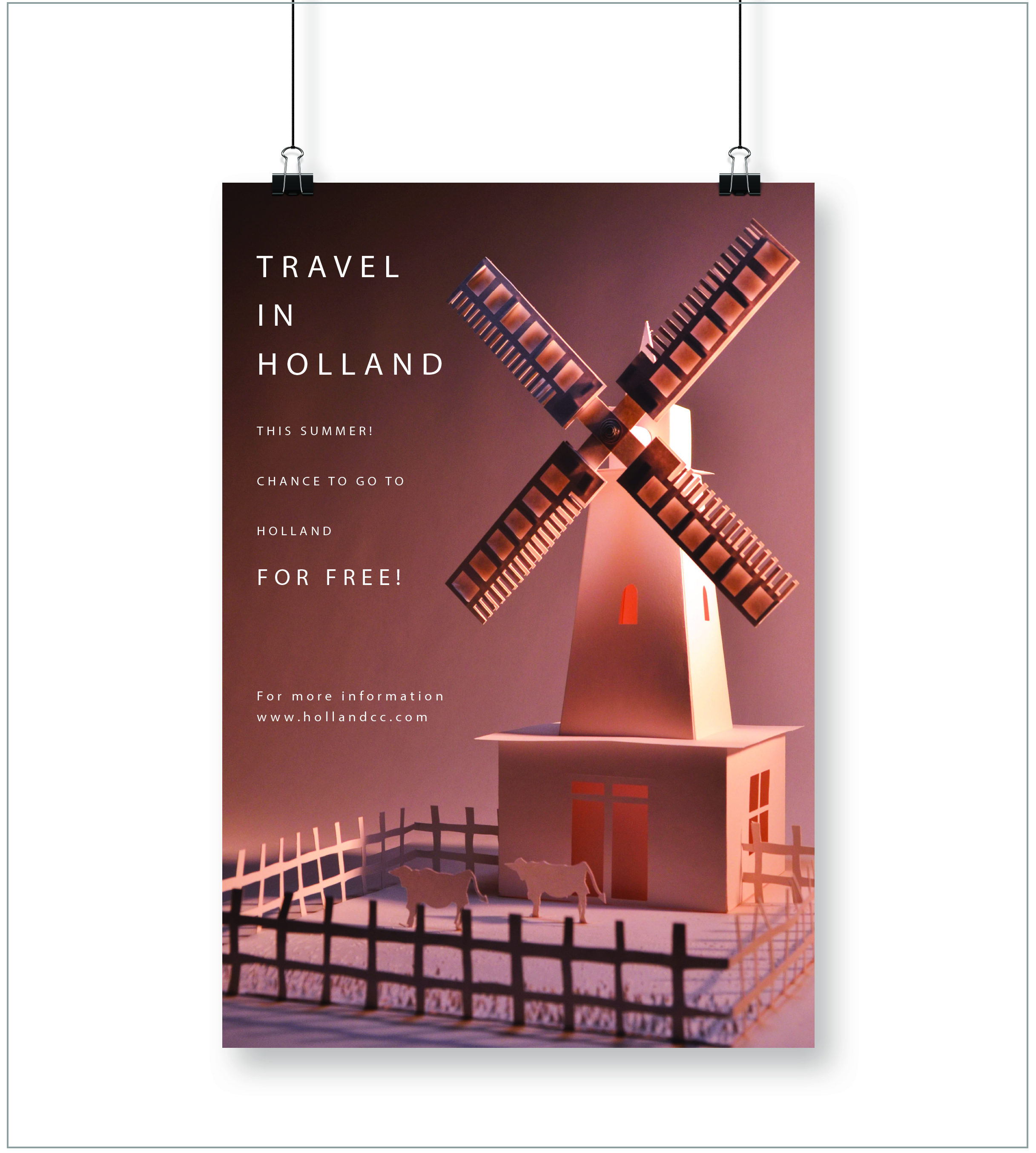 poster, I jumped at the chance to promote Holland. When I visited there, I was so attracted to the windmills and how they defined the landscape. I chose to make this poster completely by hand. I constructed the windmill and all of its surroundings by hand. I then used a direct light source to create mood, shadows, and dimension. I then added a simple sanserif typeface to complete the poster.