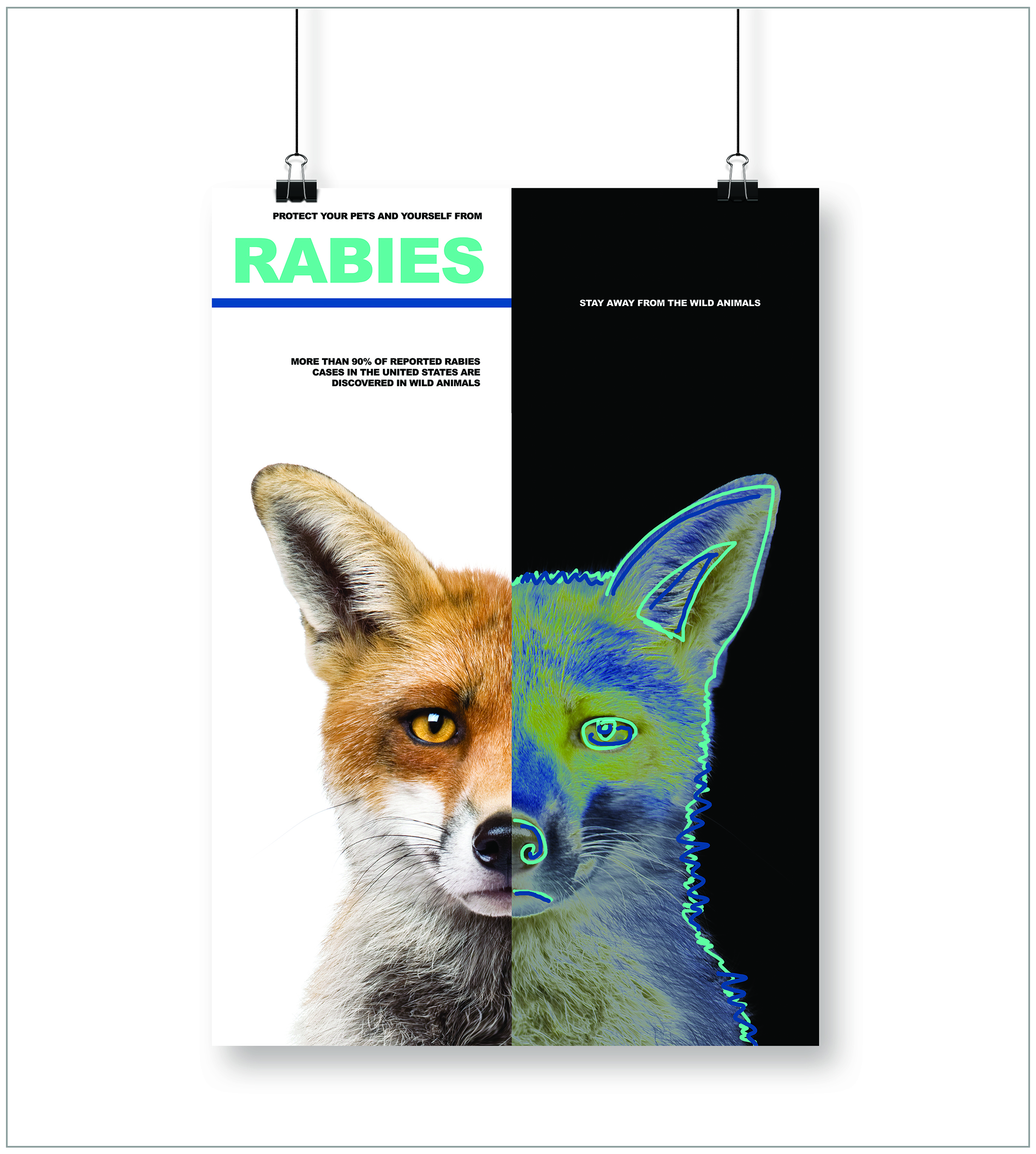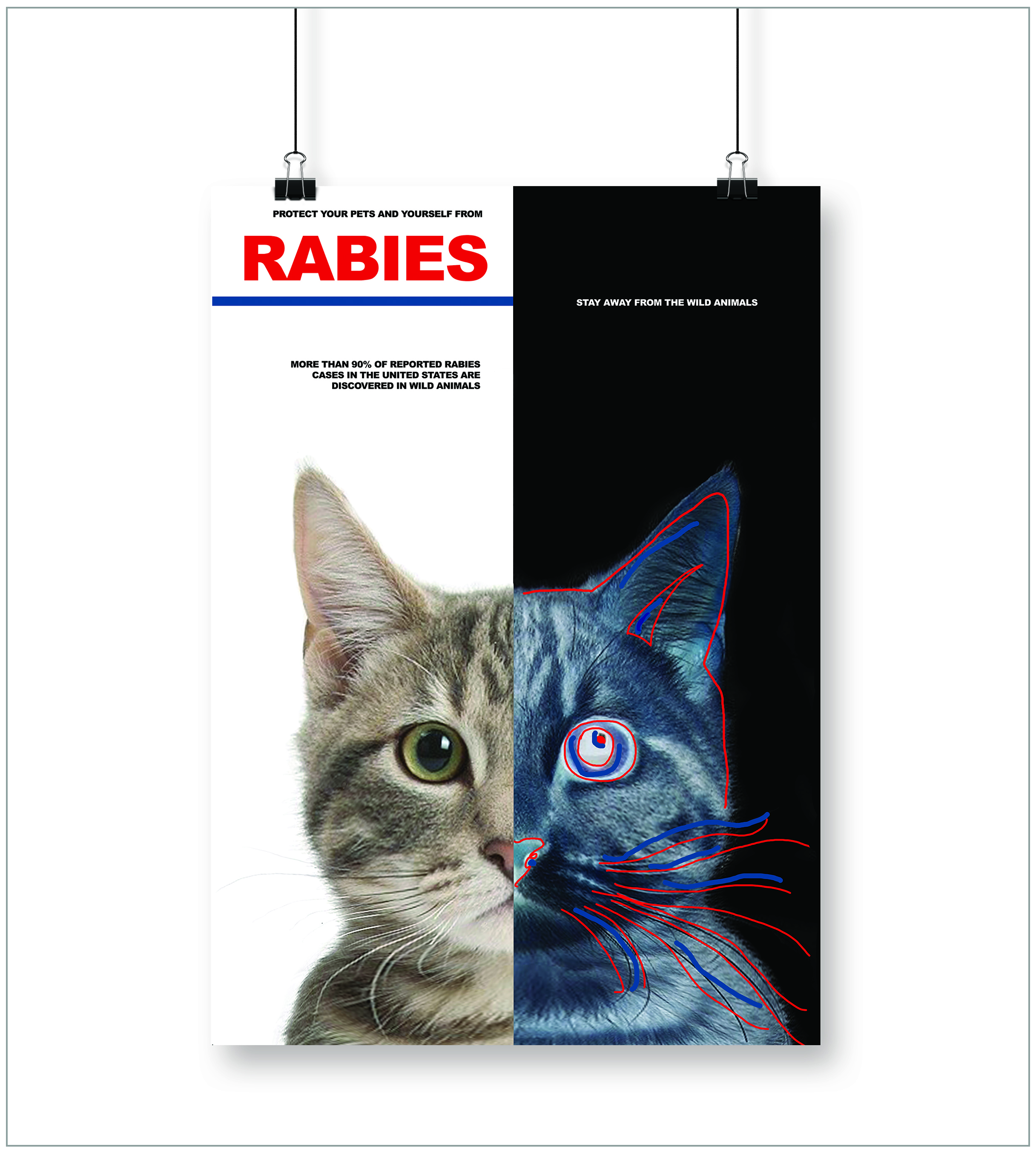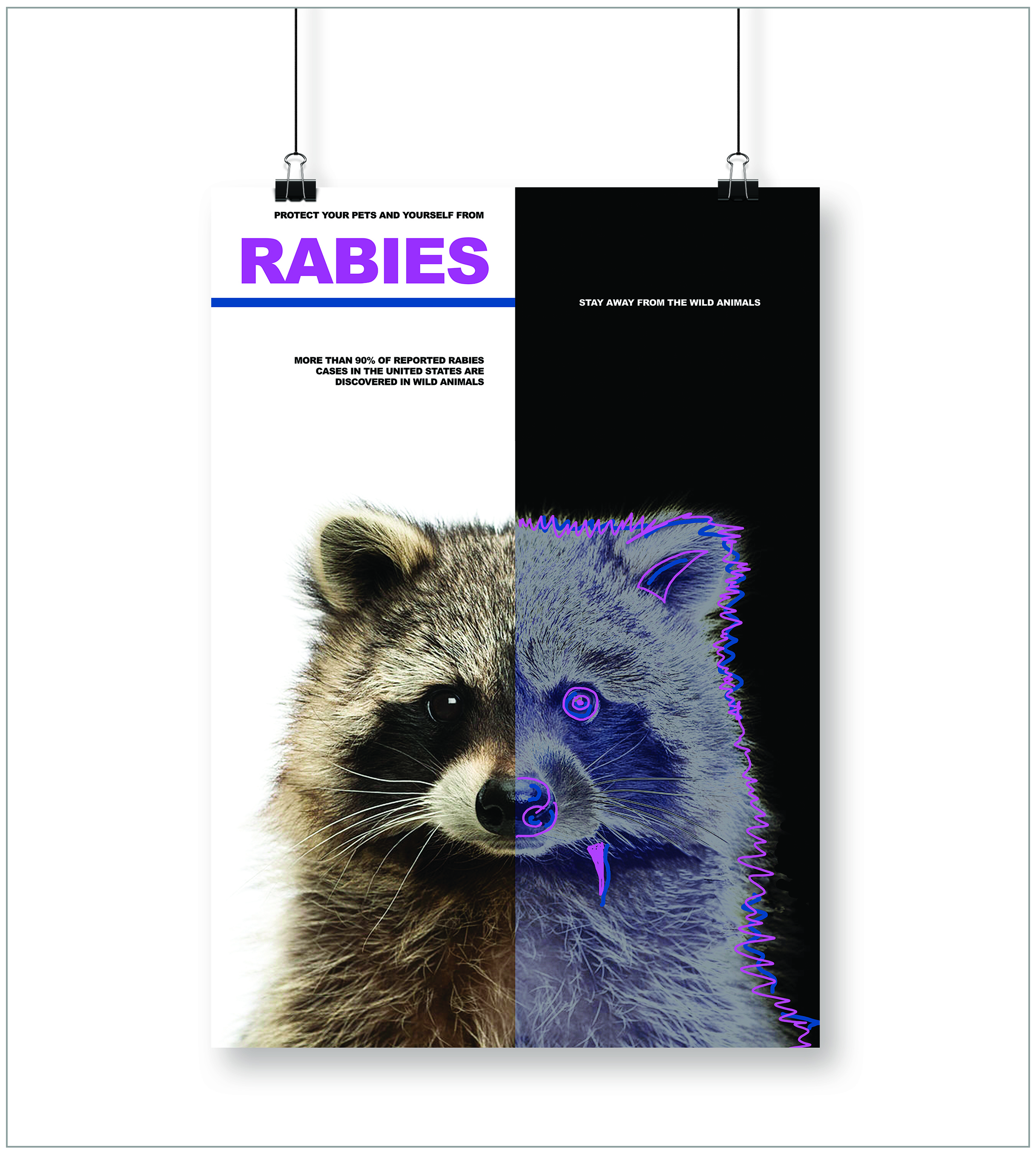 I used three images of cute, innocent-looking animals. I then divided the space symmetrically. The left side of the image remained the same, the right side of the animal became a crazed, rabies-infected beast. I added red color to the type to emphasize the danger of the disease.