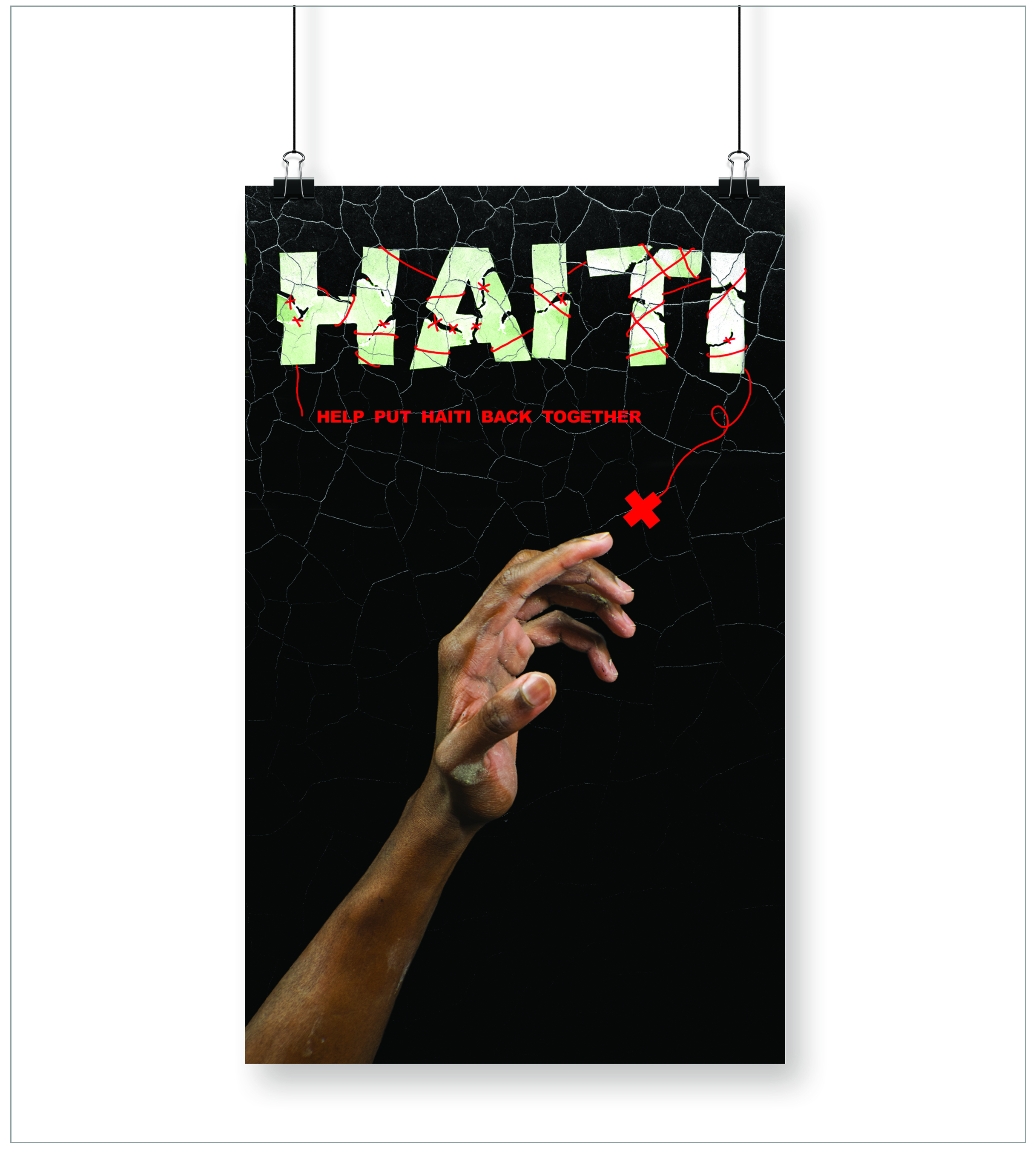 This poster was inspired by my feelings about the recent devastating earthquake in Haiti. I wanted to show the tragedy and the hope. I used my friend’ hand, covered in clay, to symbolize the people of Haiti. I also used the type as an object, torn and broken, to represent the island. Although the poster shows tragedy, it also shows the hope that the Red Cross can help and “put Haiti back together again”.